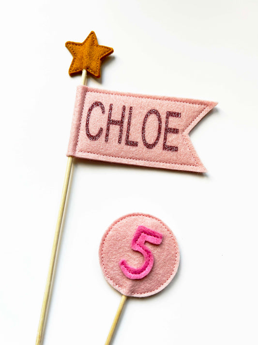 Personalized Pink Felt Flag Cake Topper