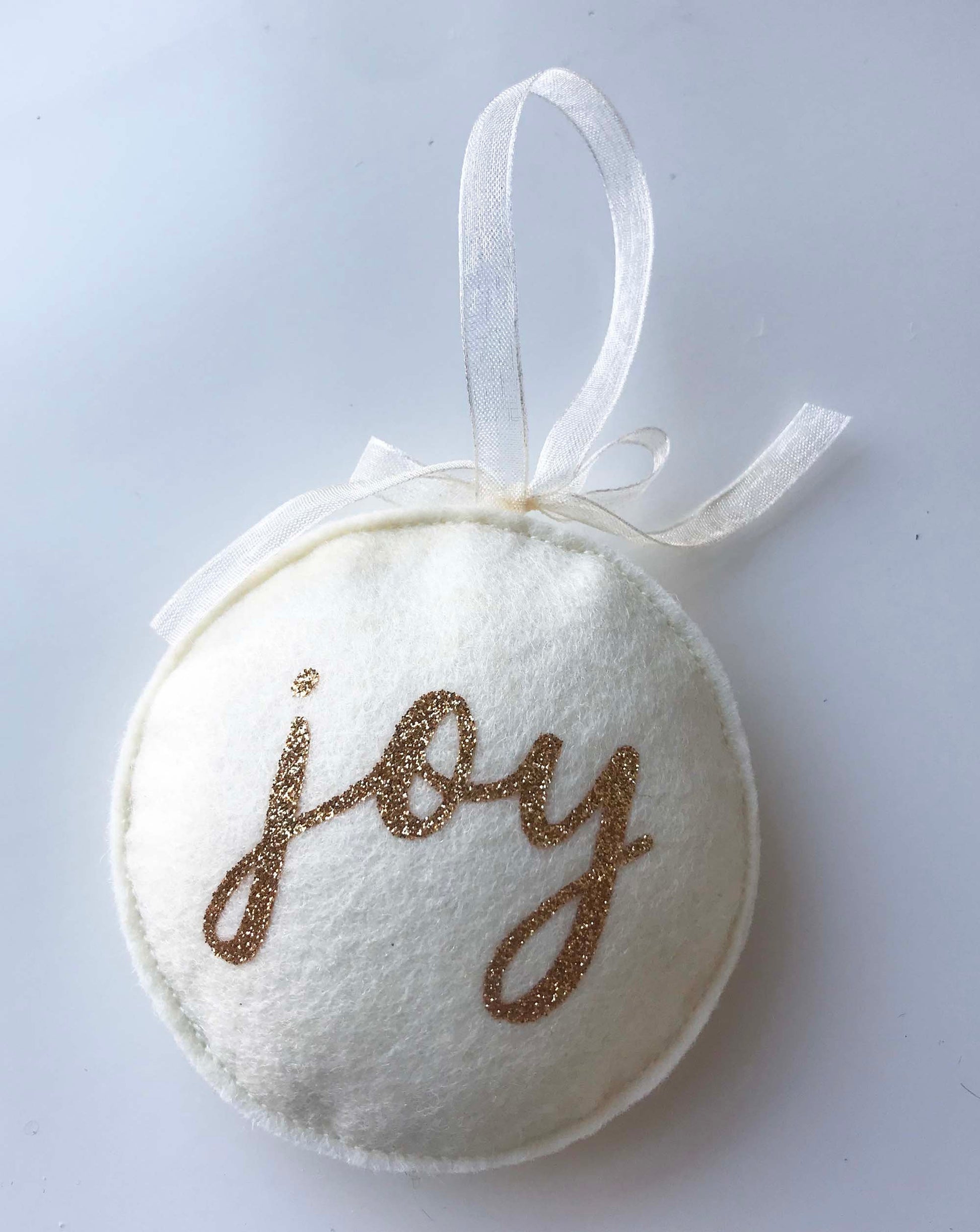 Made from ivory wool felt with black and sparkly gold vinyl wording on one side and gold glitter vinyl 'joy' on the reverse. It is stuffed with polyester filling and complete with ivory sheer bow & ribbon.
