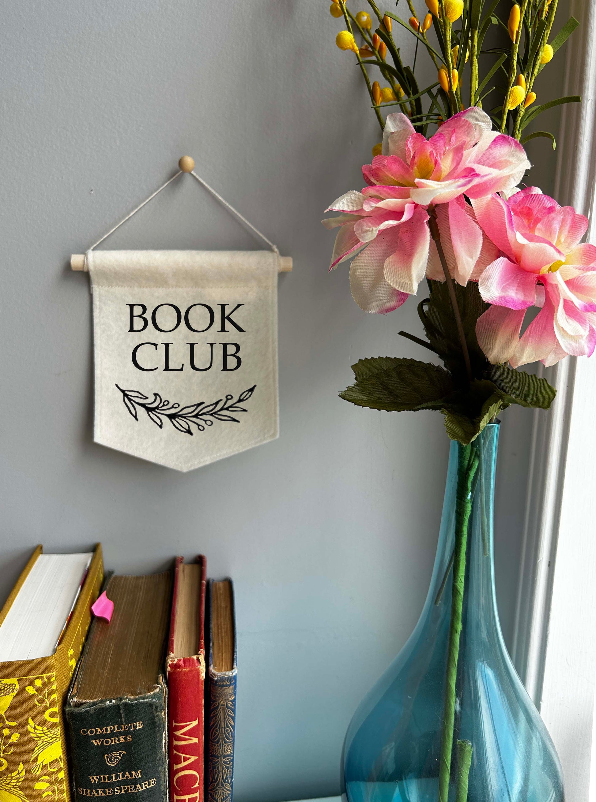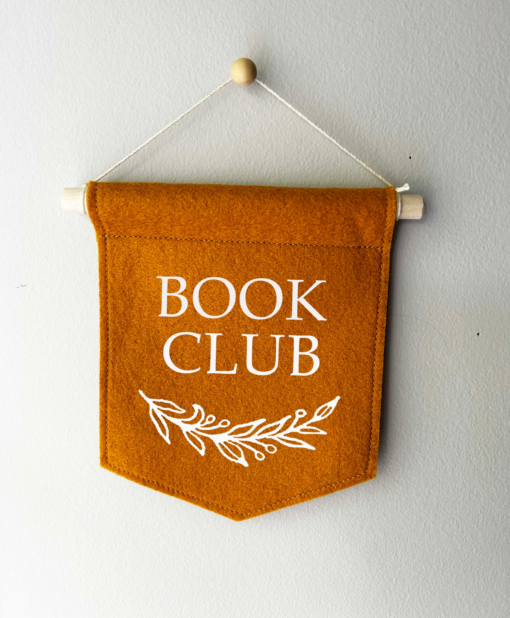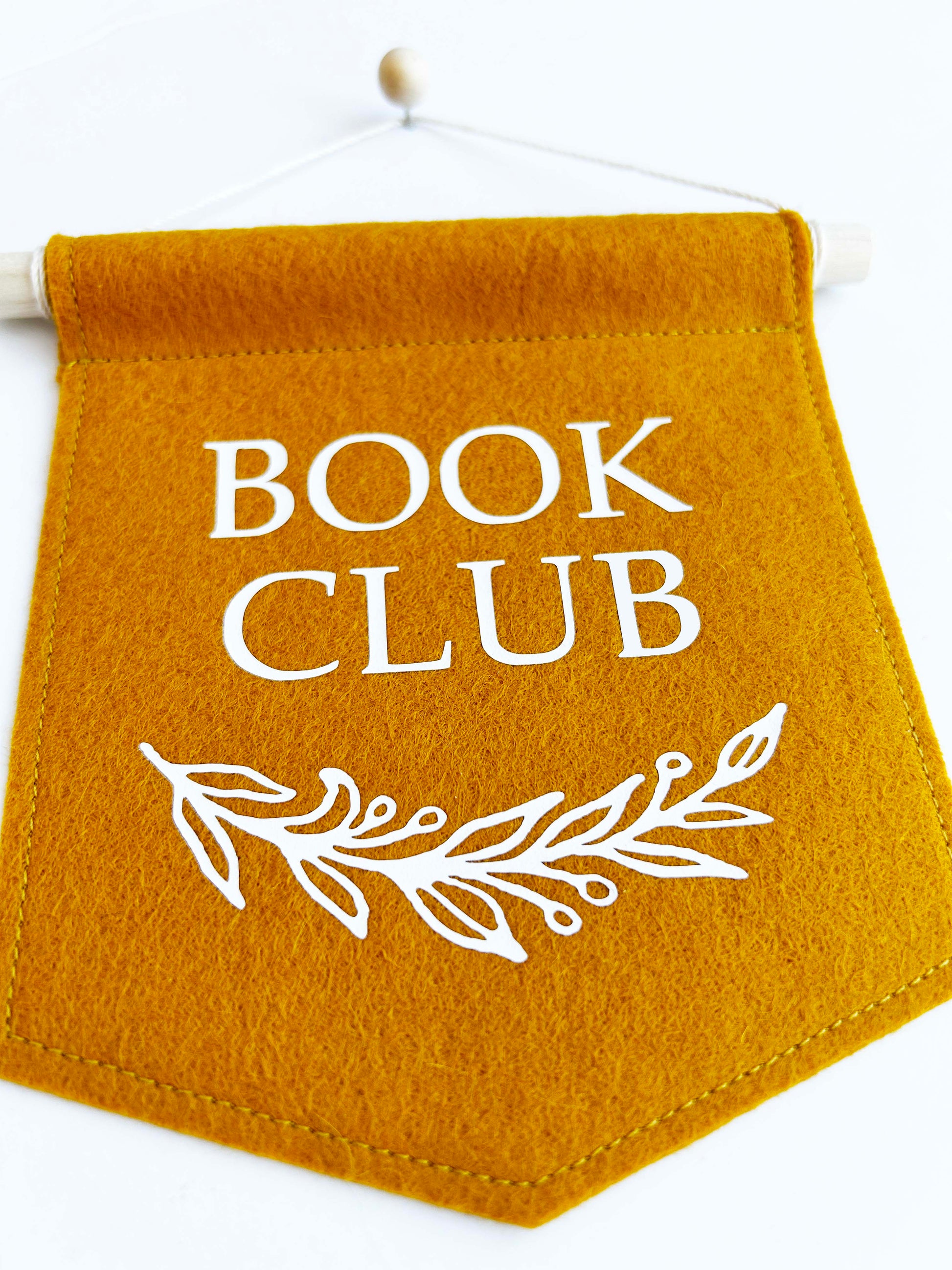 This felt sign is made from 100% wool felt - colour gold (shown here) - with lettering cut from vinyl and heat transferred to the front of the banner that reads 'Book Club'. A string is attached to the top for easy hanging.