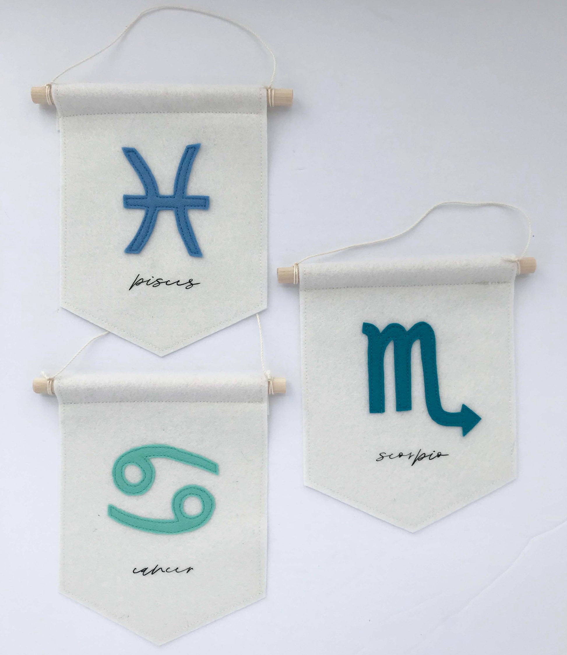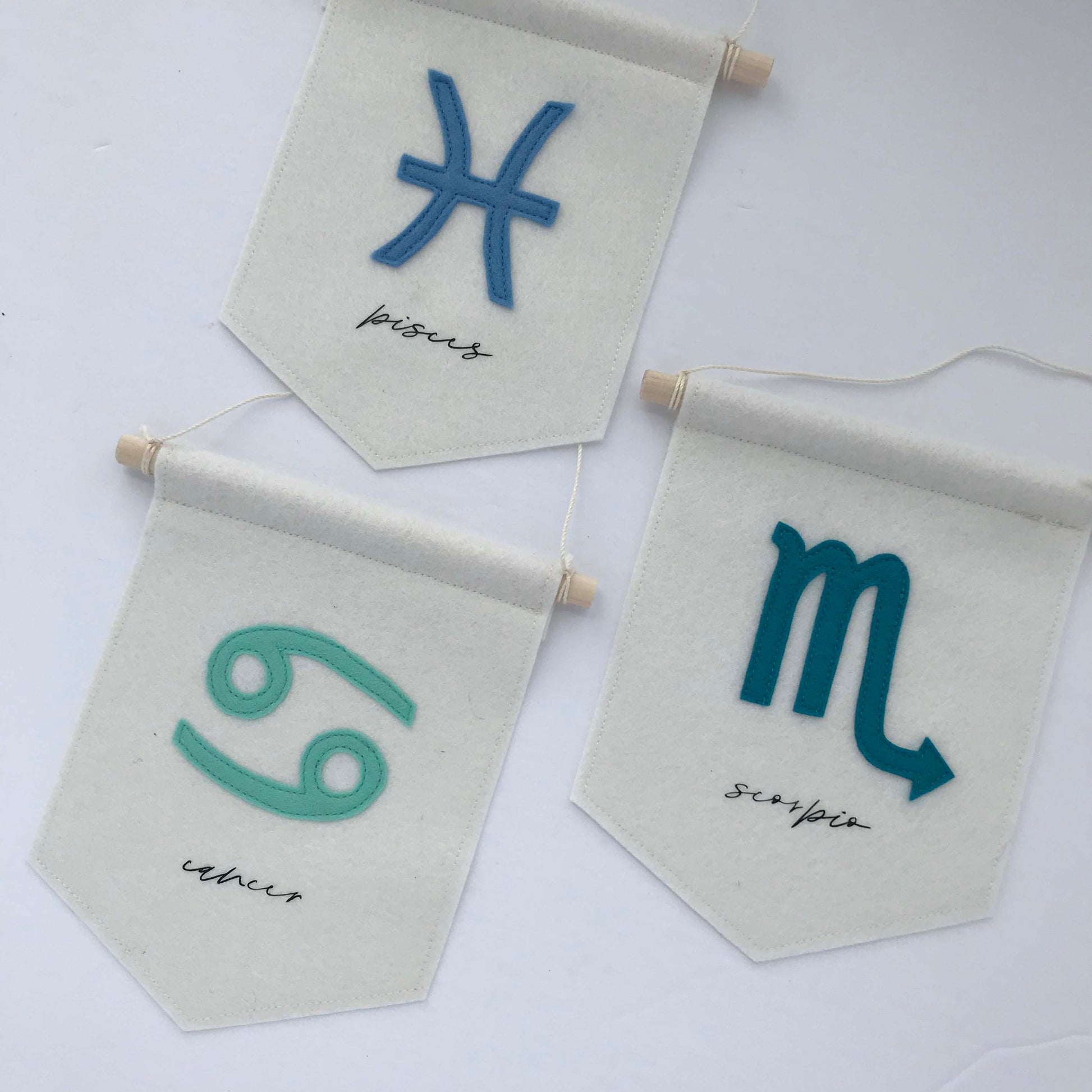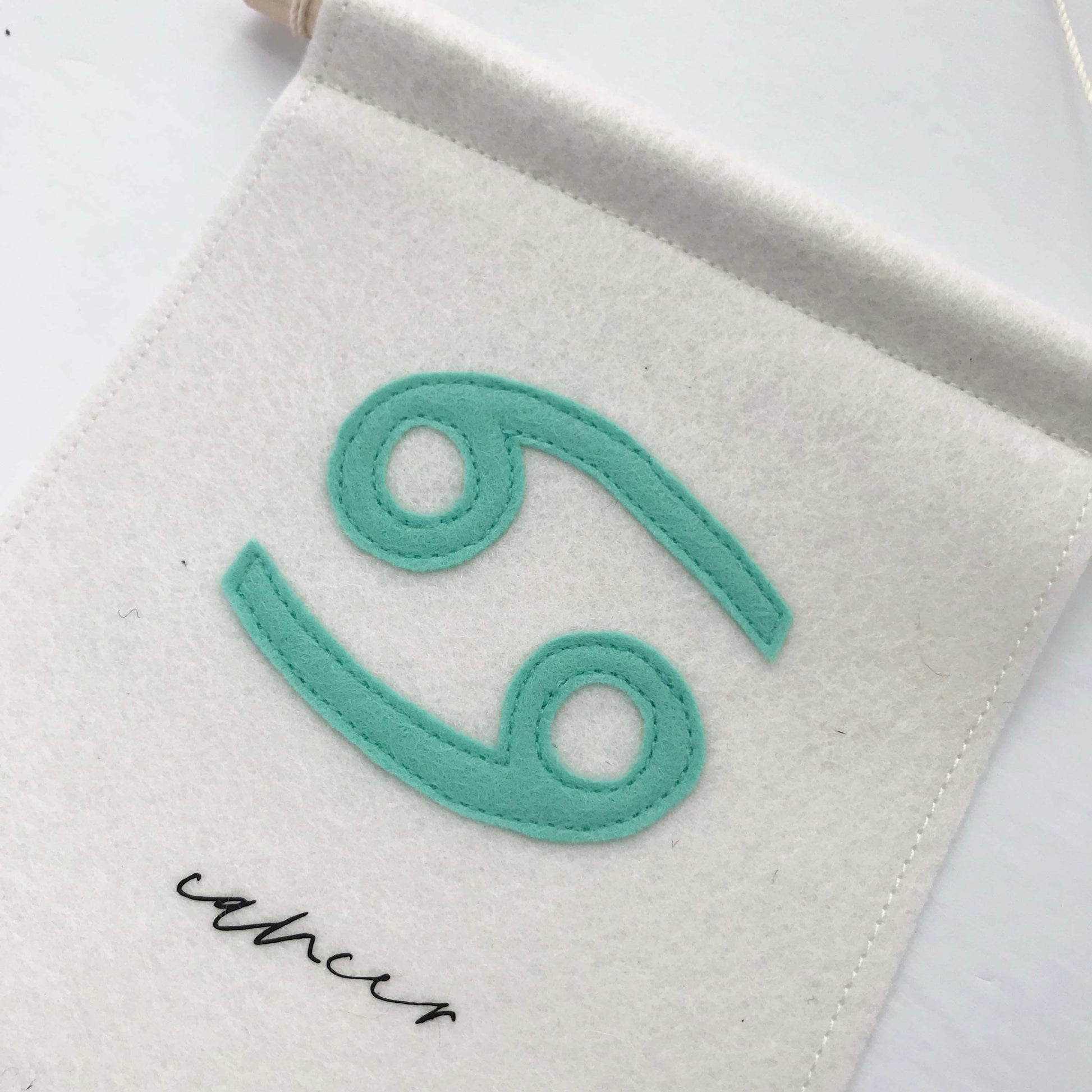 This felt wall hanging is made from 100% wool felt - colour natural - with cancer zodiac sign handcut from mint wool felt and stitched to the banner. The text is cut from black vinyl and heat transferred to the front of the banner. (Different colours are available)