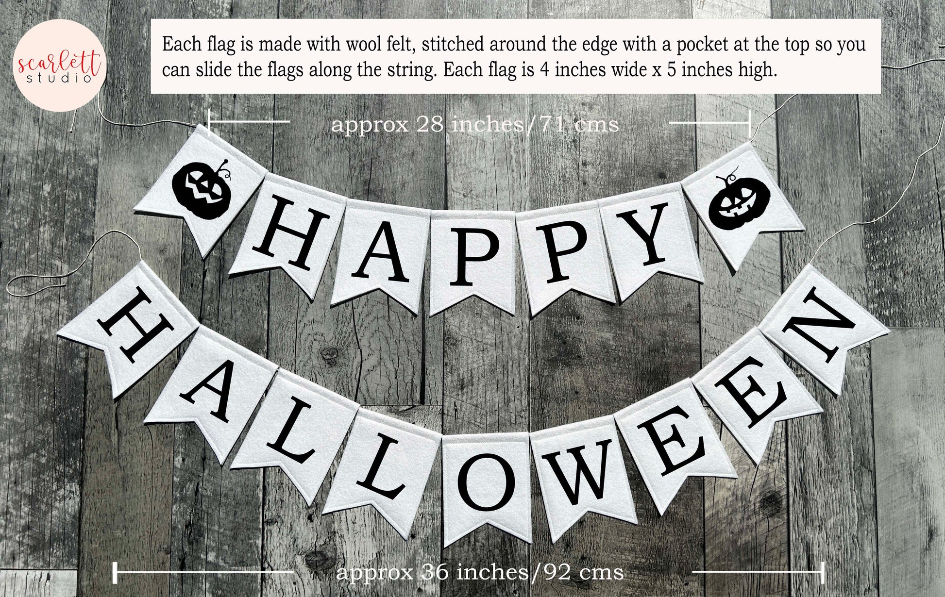 Made from wool felt each flag is approx 4 inches wide x 5 inches tall. They are assembled on 2 separate strings with additional twine left at the ends so that the flags can be easily moved and spaced to your desired width by sliding left or right. A small loop is made at each end so they are ready for you to hang.