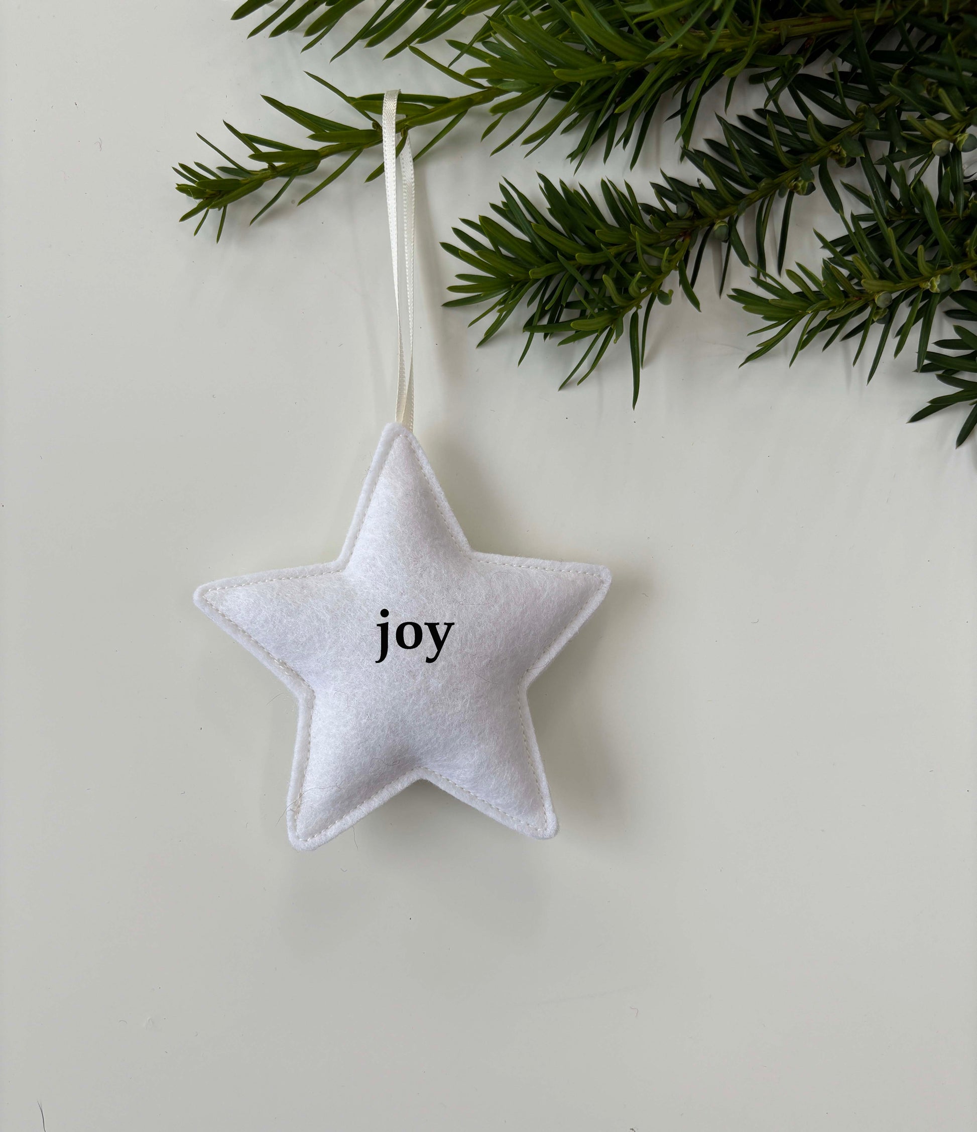 Made from natural wool felt and stuffed with polyester filling with satin ribbon loop to hang on your christmas tree, with the word Joy add to one side. This handcrafted ornament will be cherished for years to come.