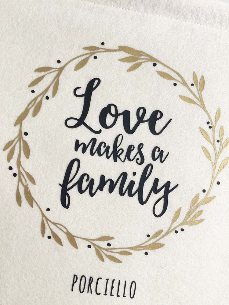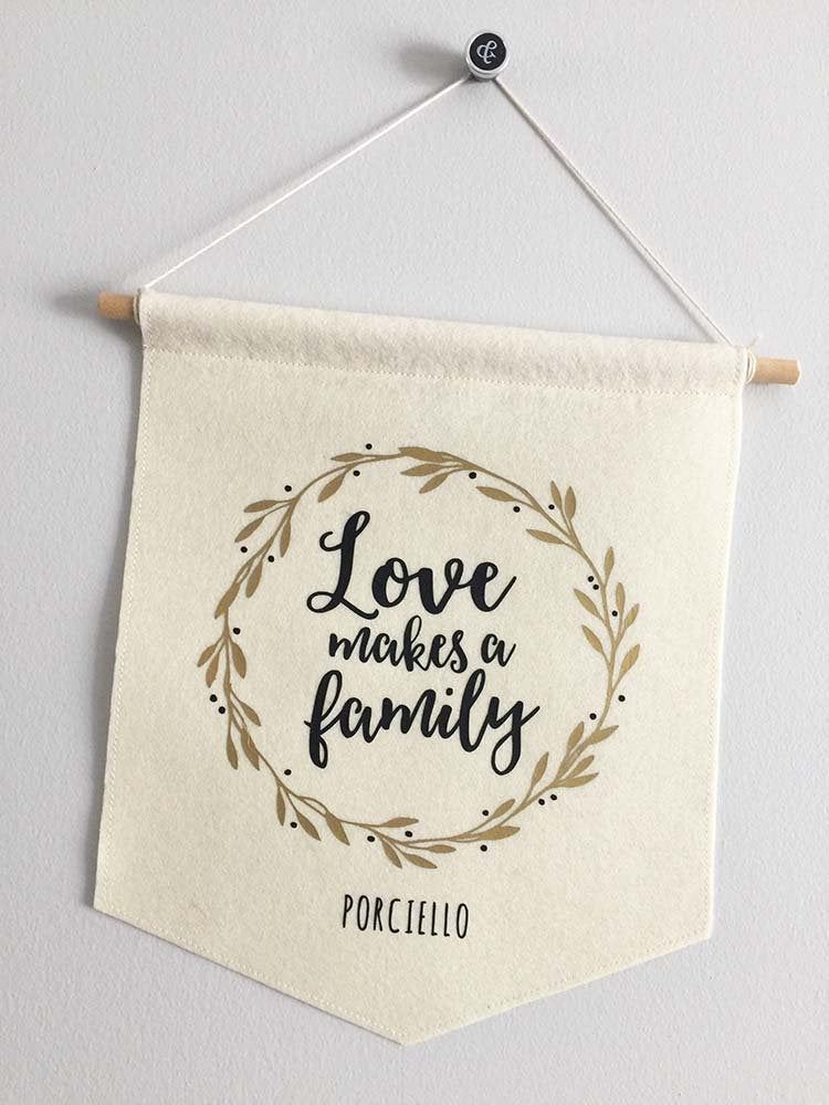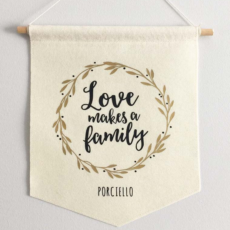 This felt wall hanging is made from wool felt - colour natural - with wreath and lettering cut from vinyl and heat transferred to the front of the banner.