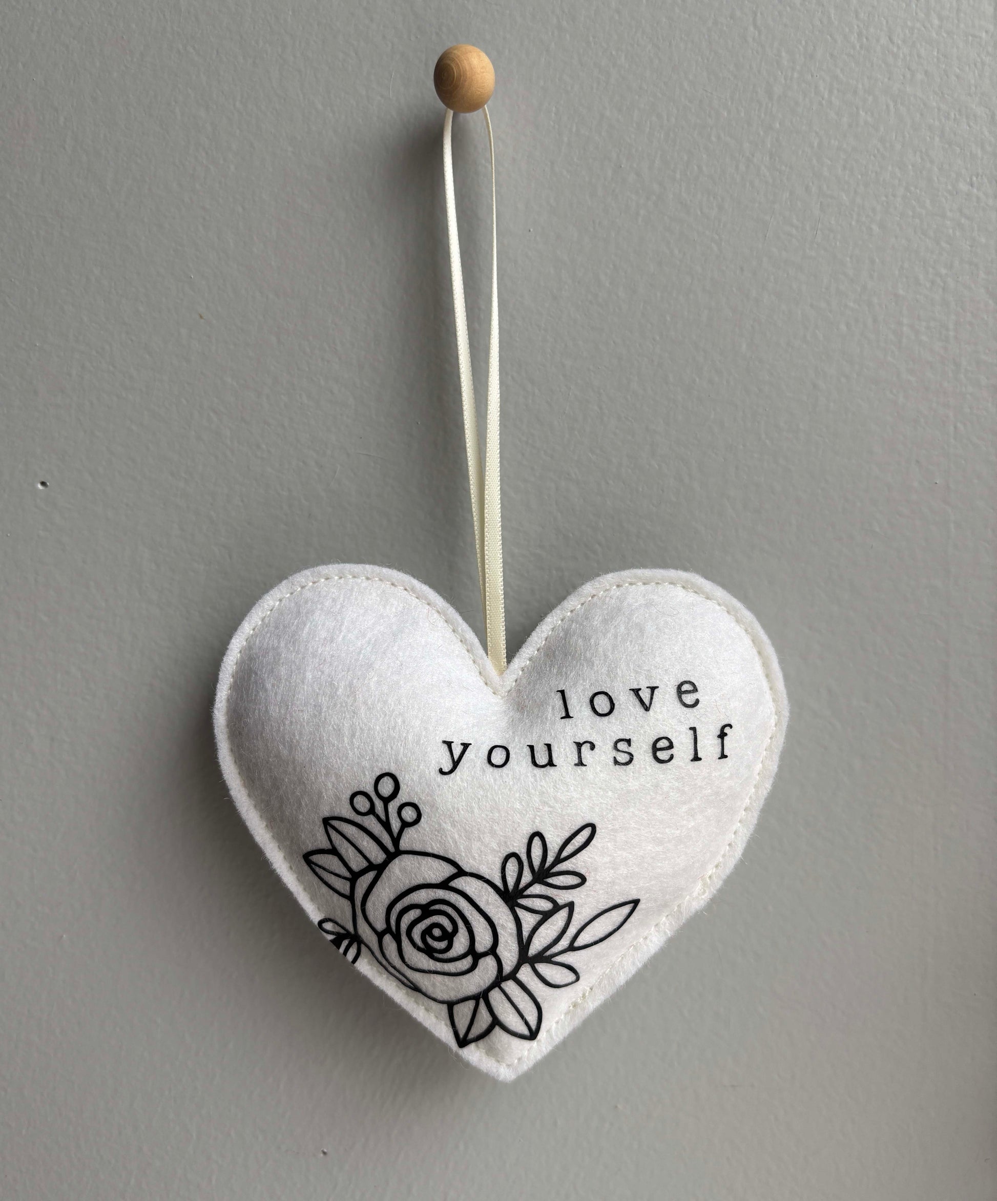 Made from natural wool felt and stuffed with polyester filling with satin ribbon loop to hang on your shelf, cupboard or door with the words 'Love Yourself' added to one side. This handcrafted ornament will be cherished for years to come.