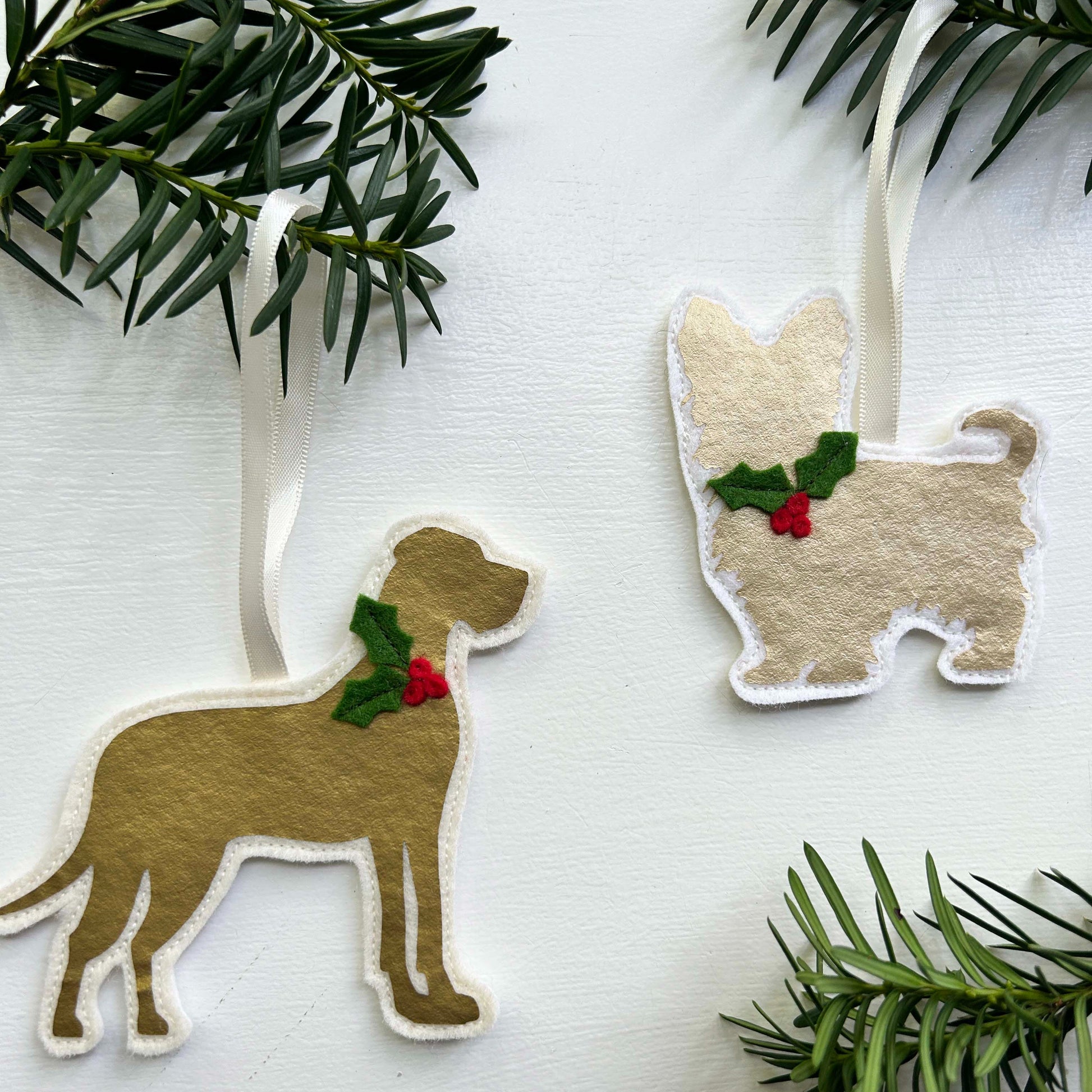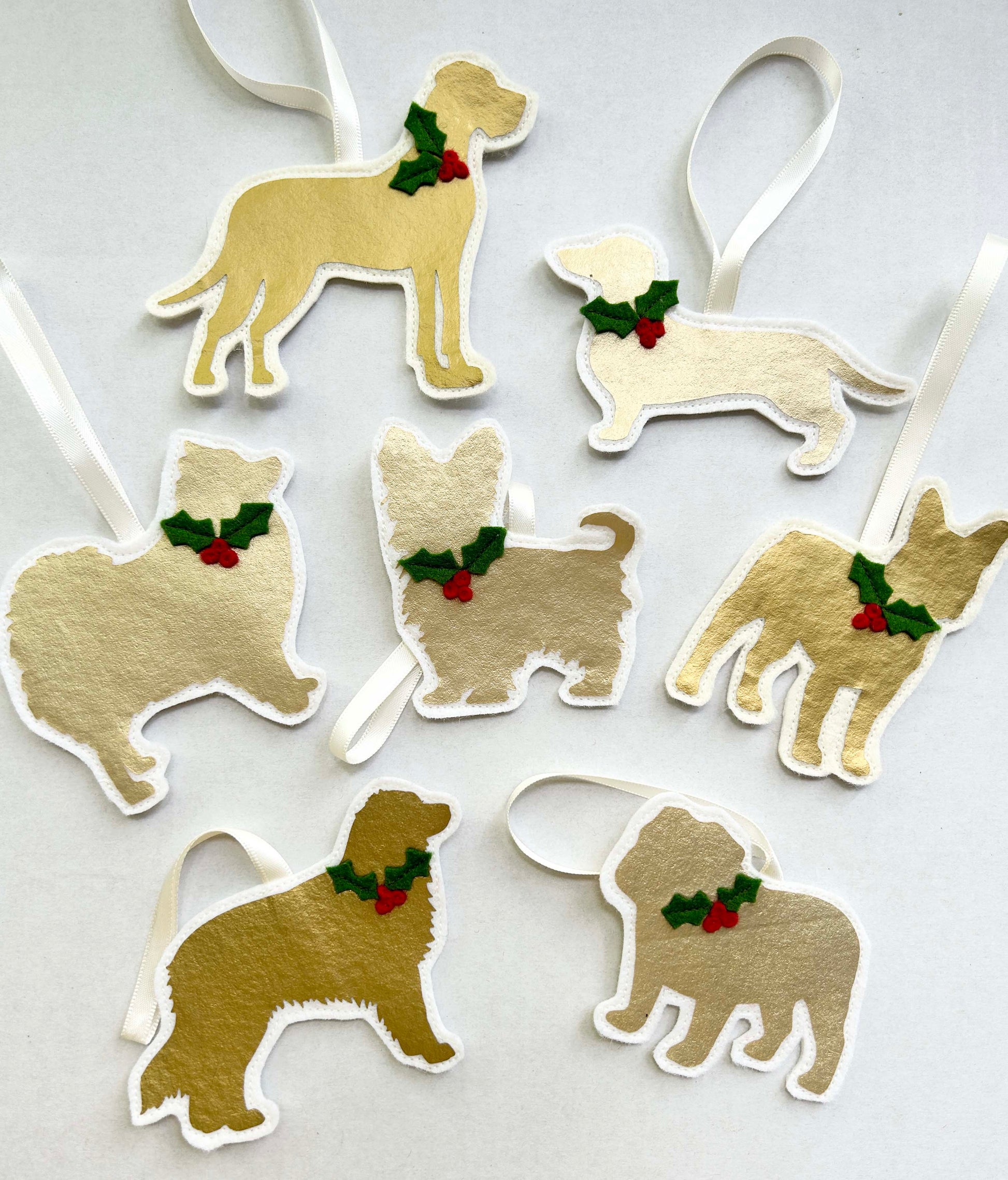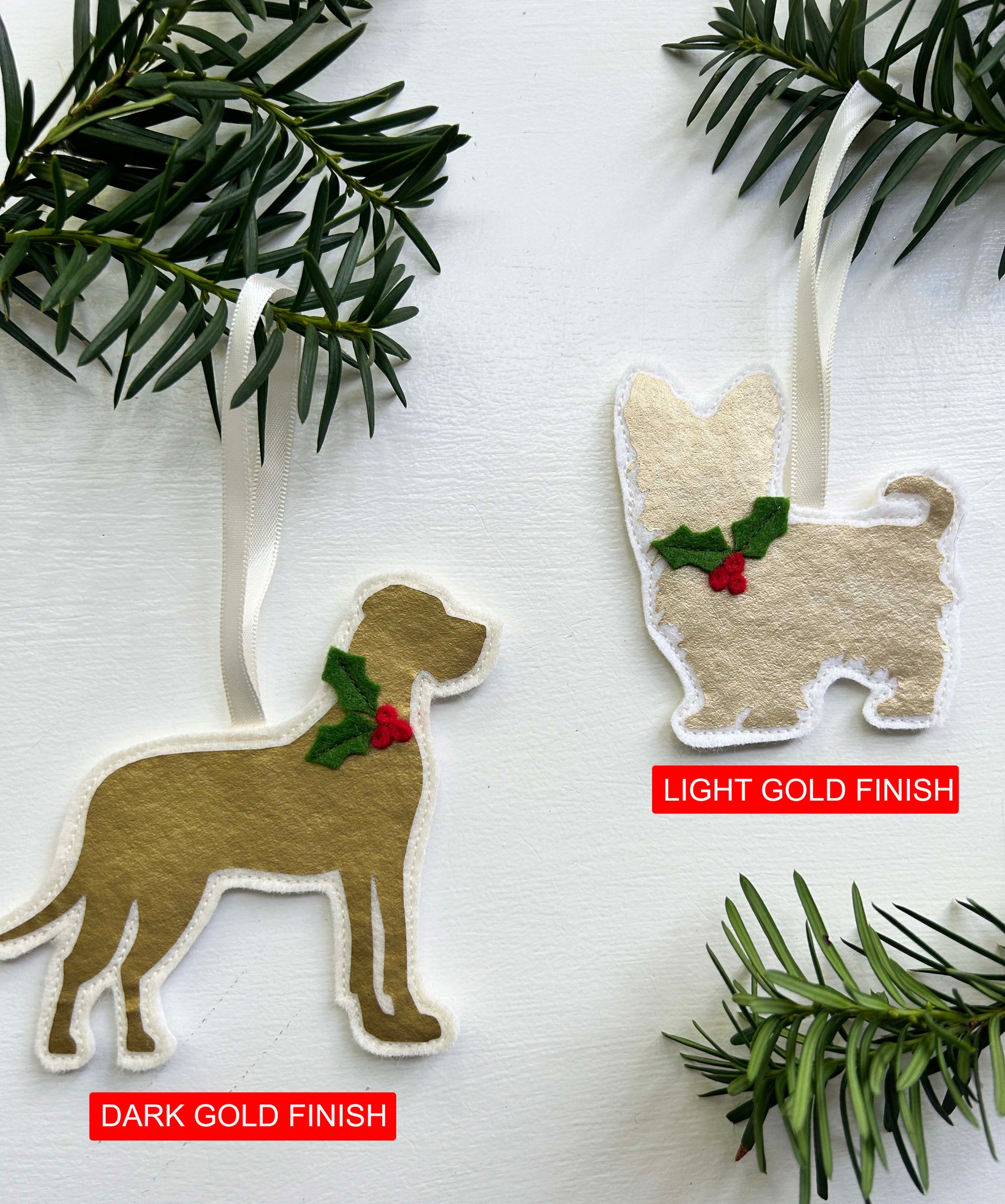 Each dog silhouette is cut from gold vinyl and heat pressed to a natural shade of wool felt. It is then handcut and sewn to a backing piece of felt with a satin ribbon. A felt holly is handcut and stitched to the dog's collar.
