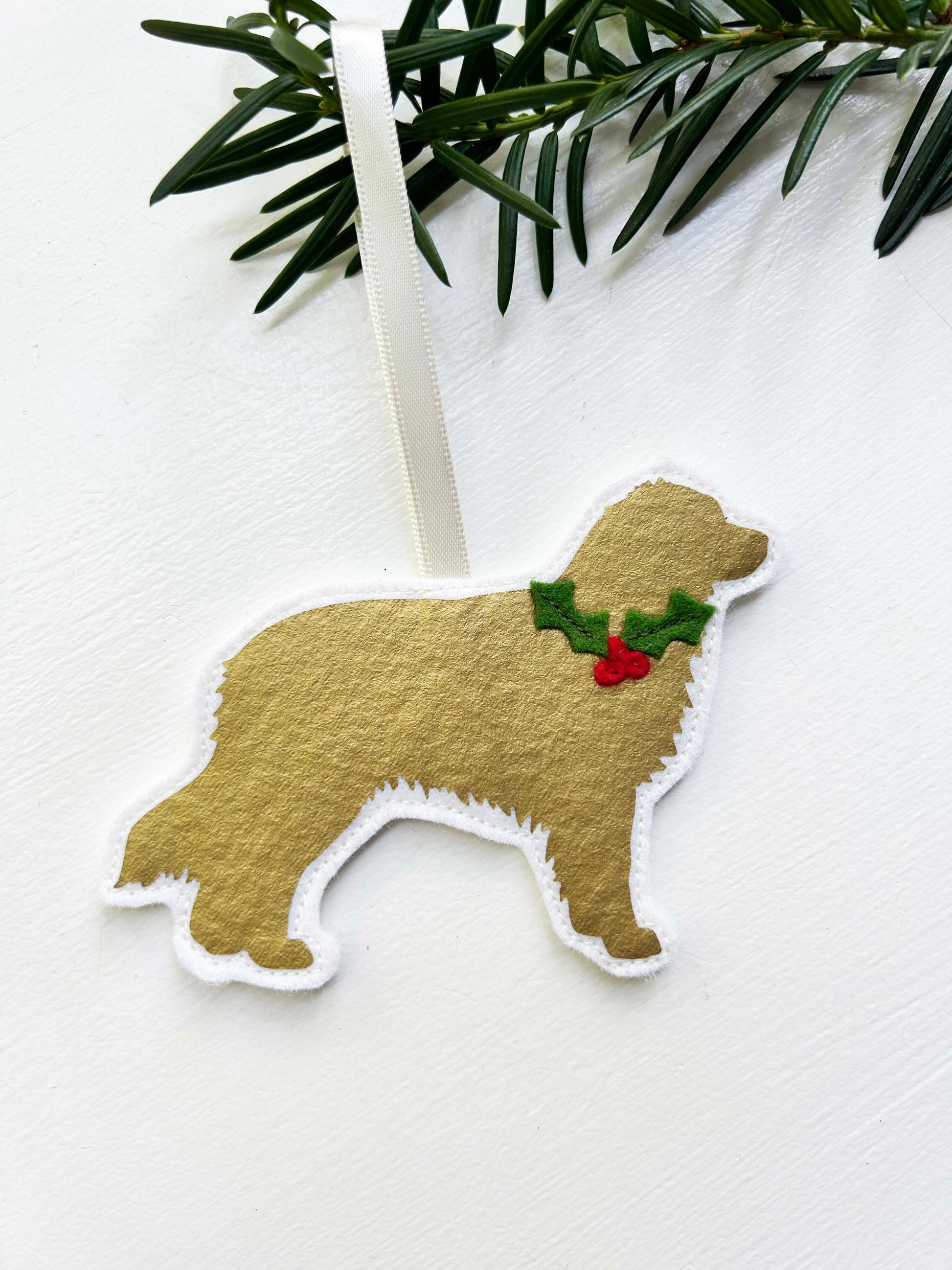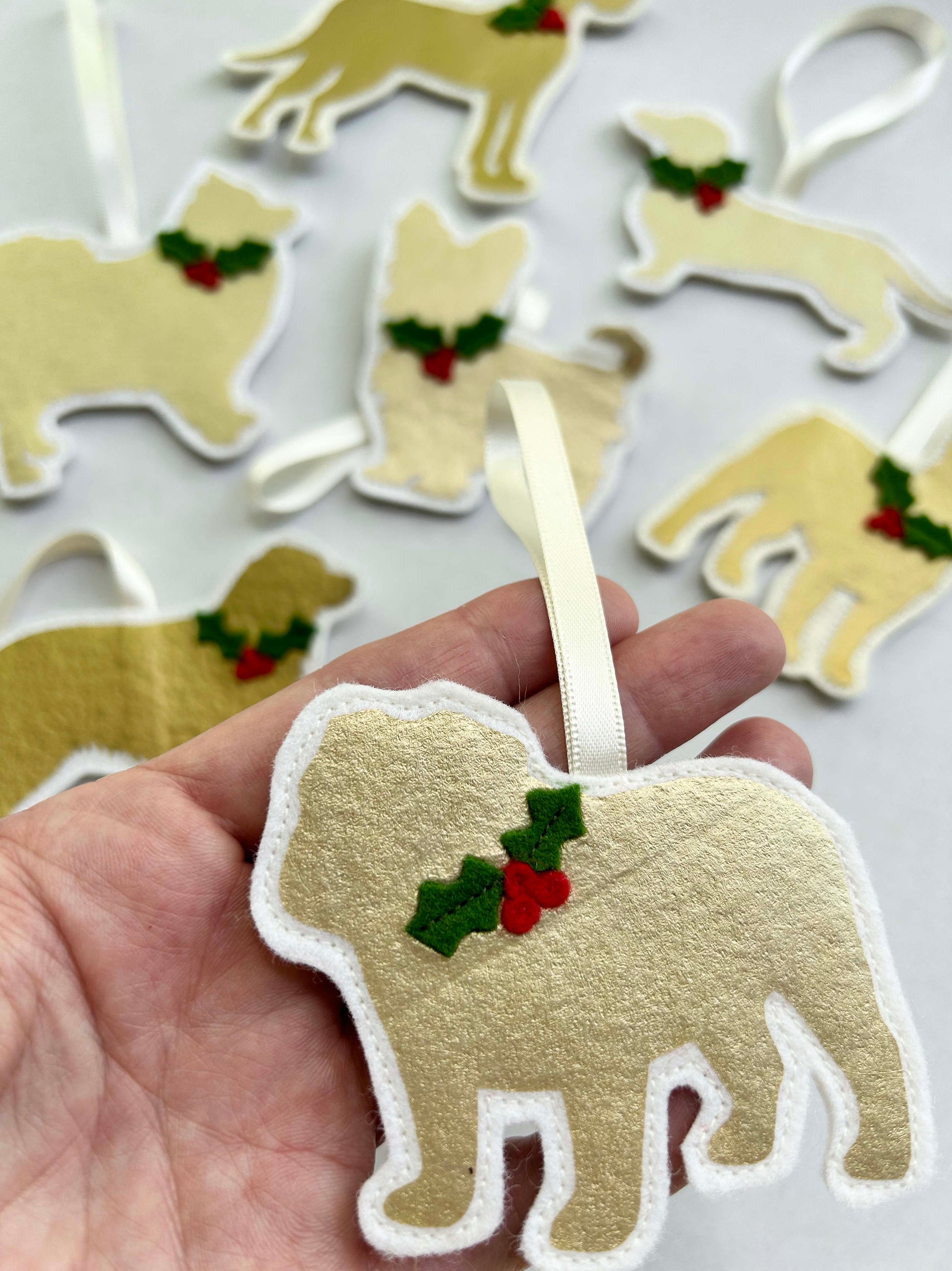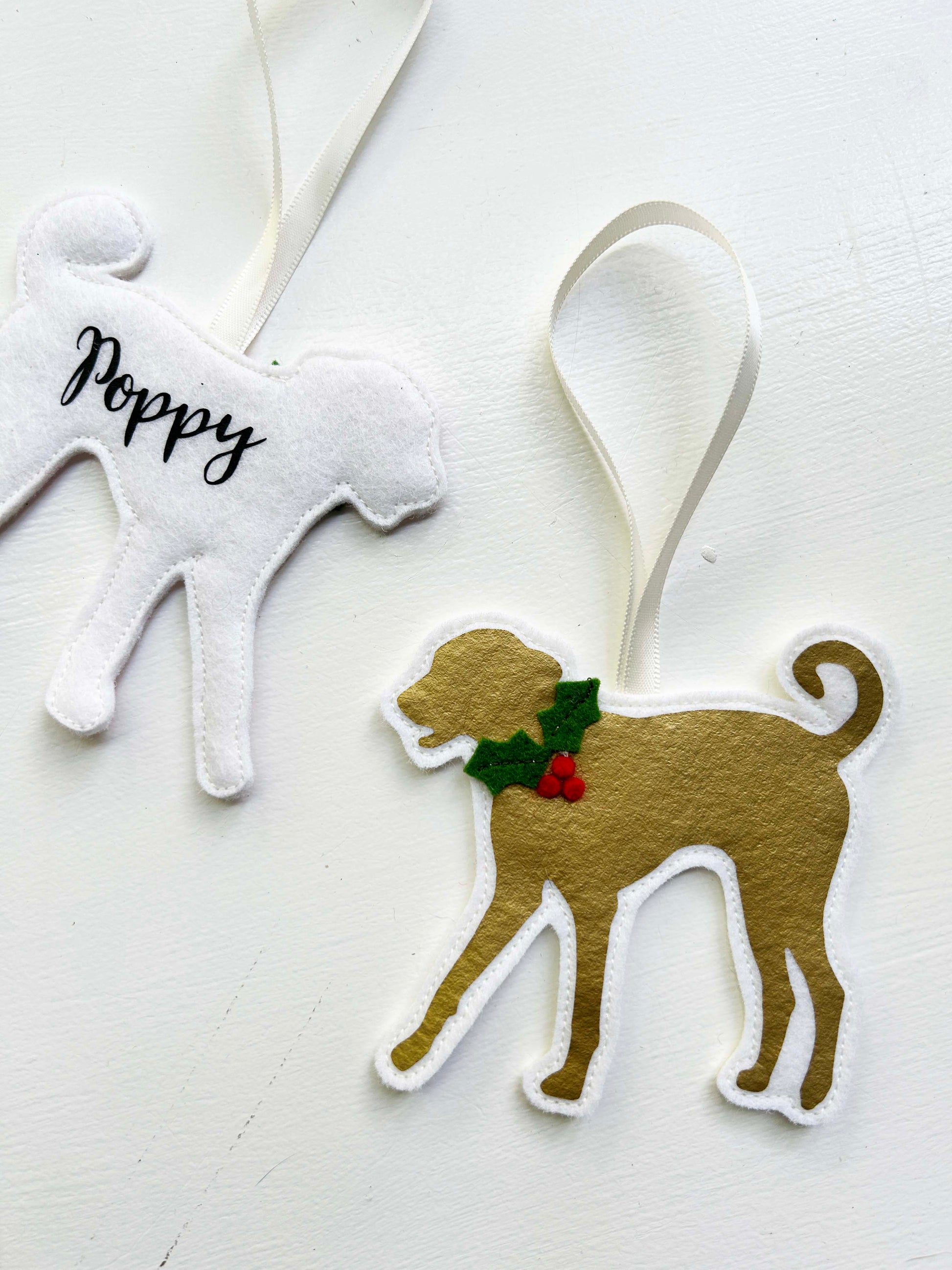 Each dog silhouette is cut from gold vinyl and heat pressed to a natural shade of wool felt. It is then handcut and sewn to a backing piece of felt with a satin ribbon. A felt holly is handcut and stitched to the dog's collar.
